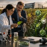 Editorial photo-illustration showing two crop-protection professionals studying a leaf beside a table of research tools, with a stressed field on one side and healthier crop rows on the other, symbolizing a broader next-generation farm-input toolbox blending biology, chemistry, and precision agriculture.